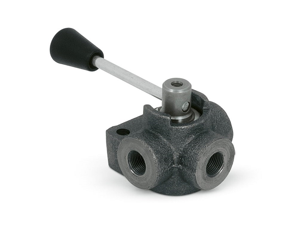 Diese Ventile werden verwendet, um den Durchfluss zu zwei verschiedenen Auslässen umzuleiten. In einer neutralen Position sind alle Ports verbunden. (open center)