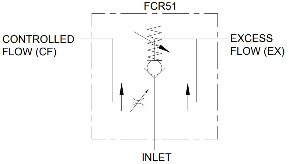 Die Ventile der Serie FCR51 sind druckkompensierte, einstellbare Stromregelventile. Durch Drehen des Griffs kann der Durchfluss aus dem „CF“ oder kontrollierten Durchflussanschluss verändert werden. Jeglicher verbleibender Durchfluss wird zum „EF“- oder Überschussdurchflussanschluss umgeleitet.